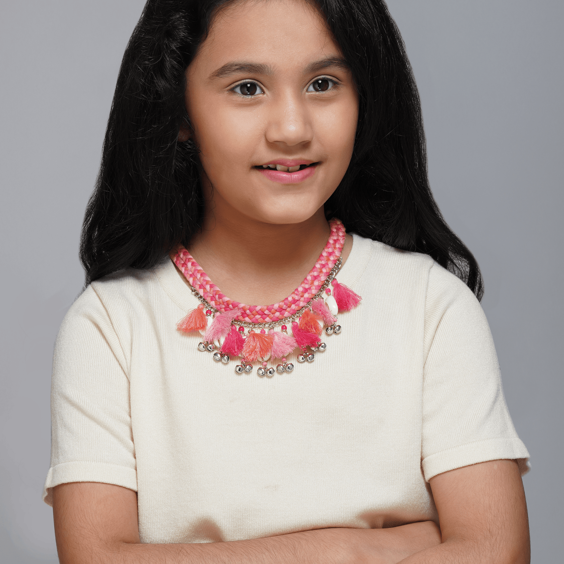 Embrace bohemian style with this vibrant and textured necklace. Featuring a colorful braided cord, flowing tassels, white beads, and silver-tone details, this piece adds a free-spirited touch to any outfit.