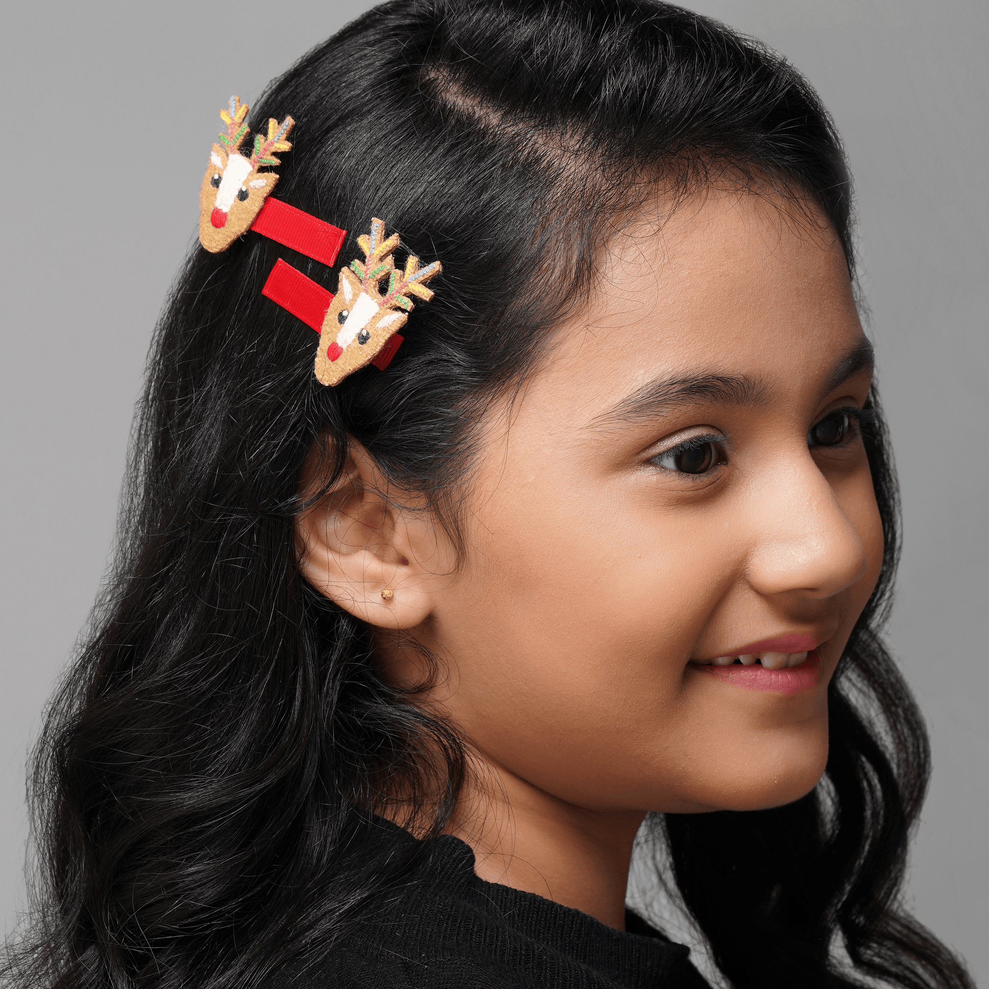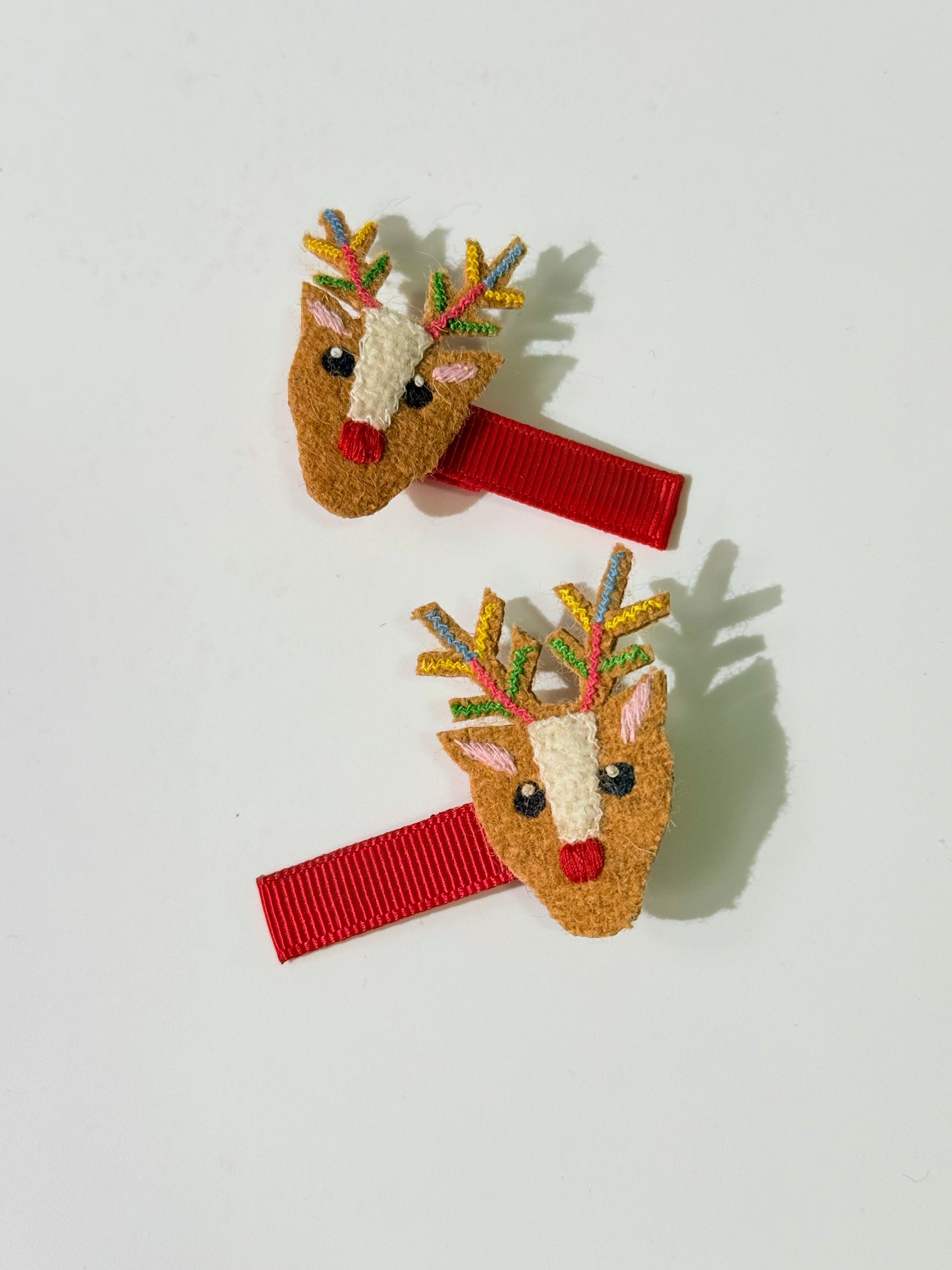 These adorable reindeer hair clips are the perfect accessory for spreading holiday cheer. The sweet felt reindeer faces with their colorful antlers will add a touch of whimsy to any hairstyle.